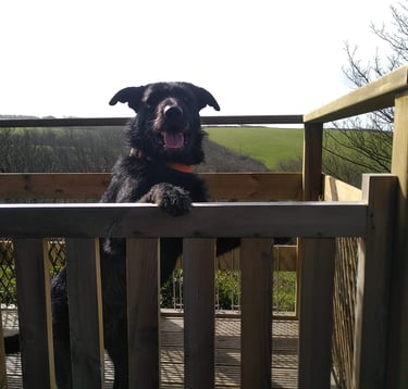 Back at the cabin, the deck is enclosed and gated, so you can sit outside together stress-free. There's a roll-up wire fence by the dining patio that you can pull around the patio at the front to create a safe dog space while you are outside. Roll it up again when you go inside or leave. An excited or boisterous dog will find it easy to knock over, so keep your beasties supervised