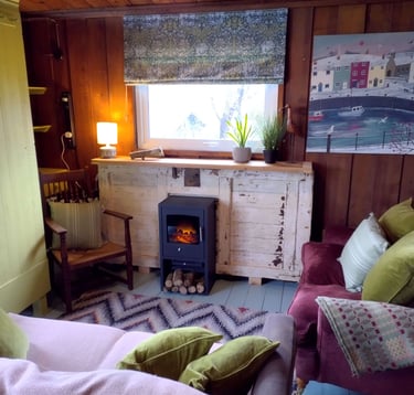 Whimsy by the Sea has a sunny south facing position surrounded by grass, bushes and trees. Sit out on the deck running the width of the cabin, and soak up the amazing views over the valley (the deck is gated too, great for dogs). At the side, there’s a dining patio and an outdoor tap; and there’s also on-site parking.